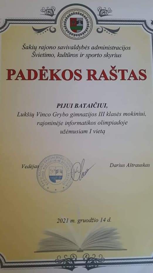 Sveikiname 3g klasės mokinius Nojų ir Pijų Bataičius rajoninėje informatikos olimpiadoje užėmus garbingas I-ąją ir III-ąją vietas. Mes jumis didžiuojamės👏🎉